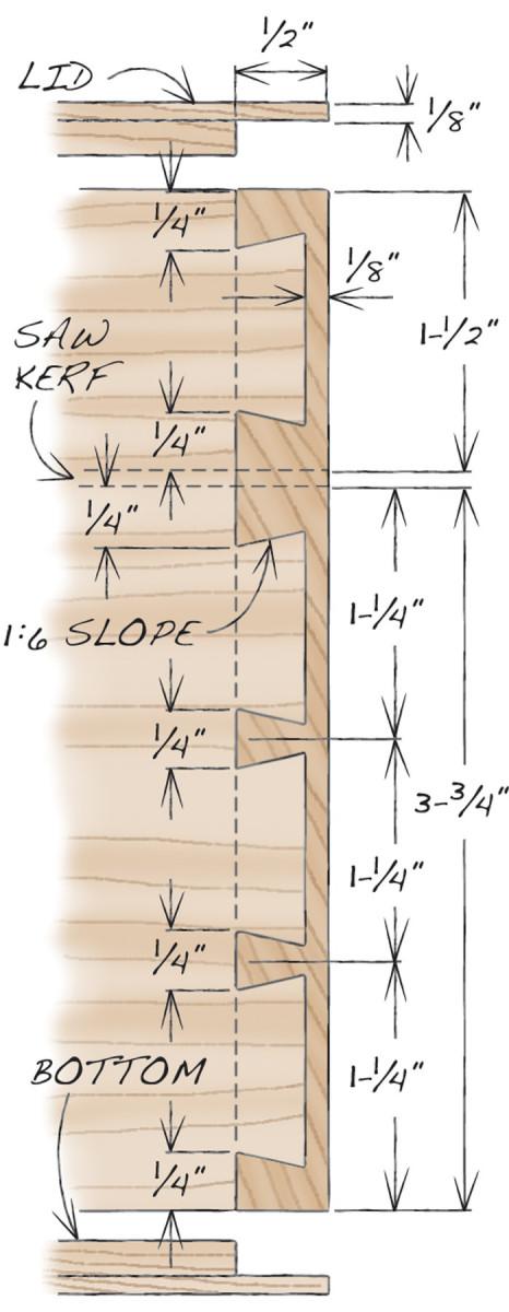 I made this box with an unusual kind of joint: double lap dovetails. While there are many ways to join a box, I believe dovetails are the best choice; they’ll never come apart. However, through or half-blind dovetails wouldn’t be appropriate for this design. Over time, they’d show under the crossbanding covering the box’s corners (see The Telegraphing Effect, below). Double lap dovetails avoid this problem.