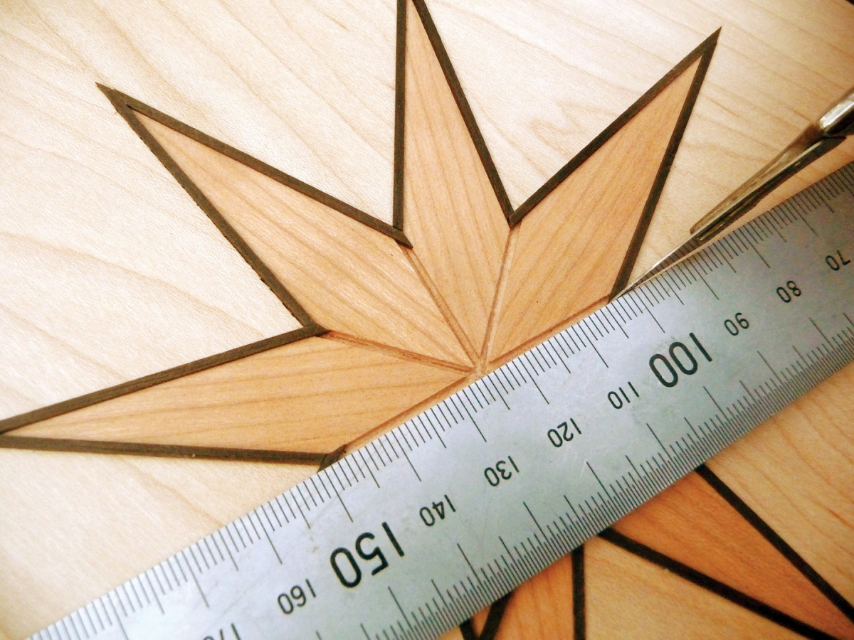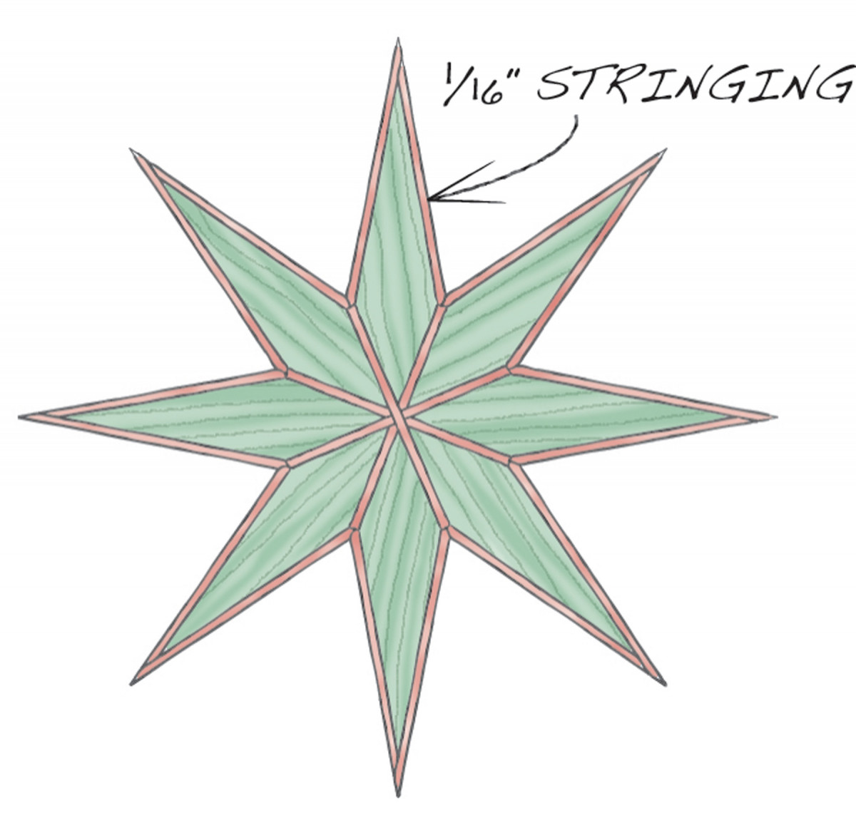 18. Glue stringing in the grooves. Trim the ends of each outer piece with a knife, guided by a straightedge, in order to fit the pieces that will go across the star.