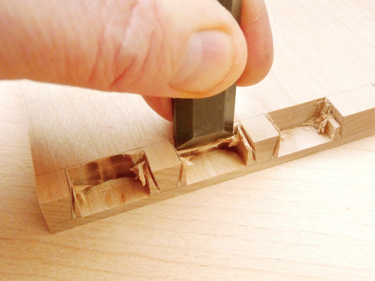 2. Remove the waste around the pins. Use a router first, then use a chisel to clean up the end grain and corners.
