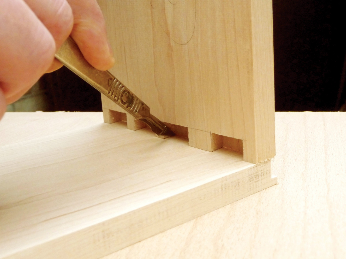 Lay out the dovetails on the side pieces. First, scribe gauge lines 1/2″ in from the end on the pieces’ inside faces. Next, use a router table to cut 3/8″ x 1/8″ rabbets on the ends. Stand each side piece on the gauge line of the corresponding end piece and trace around the pins (Photo 3). Saw and chop out the waste (Photo 4).