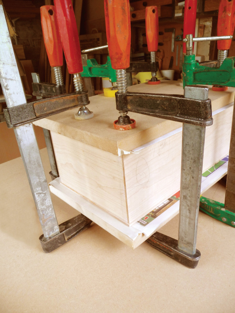 5. Glue on the top and bottom pieces. They’re rabbeted all the way around to fit inside the box. Use a flush-trim bit to remove the overhanging lips of these pieces.