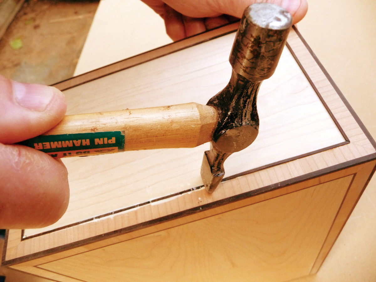 10. Glue 1/16″ square ebony stringing into the groove. Press in the stringing with a hammer—it doesn’t need to be clamped.