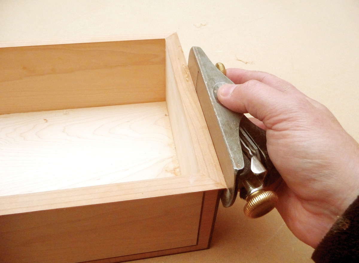 12. Glue 1/16″ thick cherry edging to the top edges of the base and the bottom edges of the lid. Trim the edging with a low-angle block plane.