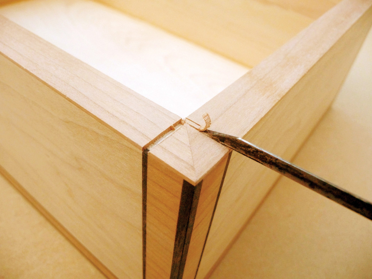 Continue the 1/16″ stringing around the corners of the lid and base (Photo 13). Score these grooves with a marking knife first, then remove the waste with a 1/16″ chisel. Add a small ebony square on each outside corner, so the 1/8” stringing appears to run right through the corner.