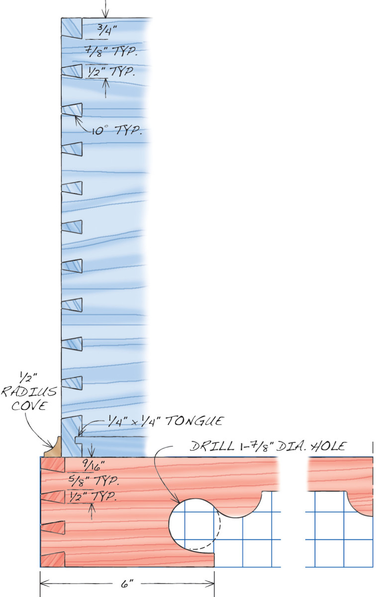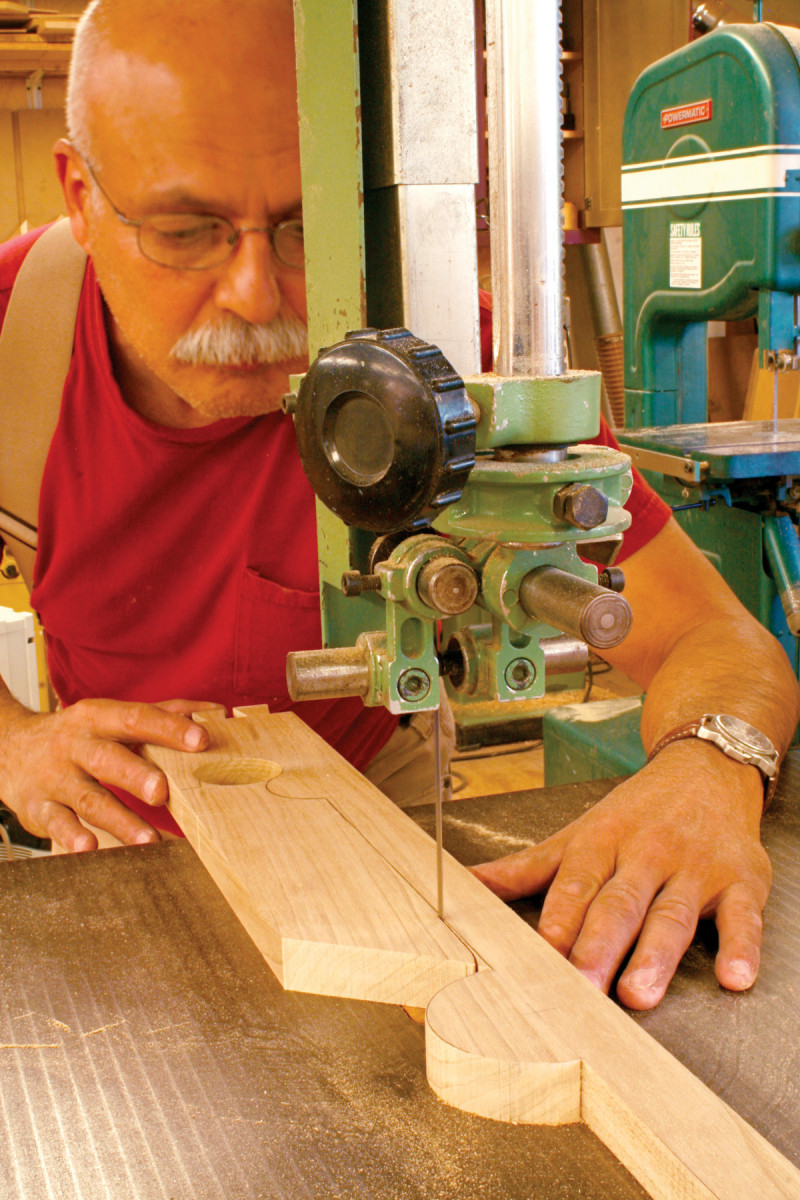 Mill the base’s front (J), back (K) and sides (L). Cut their dovetails (Fig. C) and saw the cutout in the front piece. Start the cutout by drilling large-diameter holes at each end, then saw the rest on the bandsaw (Photo 9). Glue the pieces together and even up the joints.