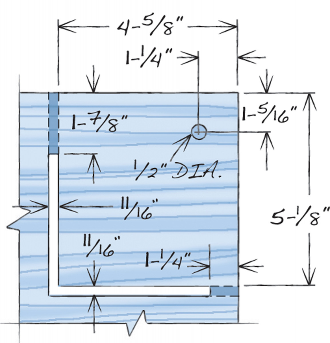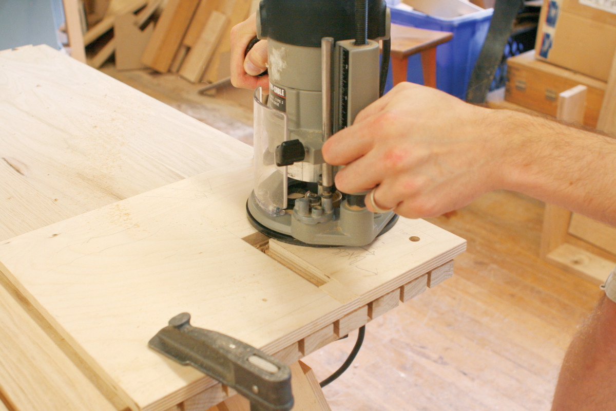 5. Rout grooves into the front and back panels to hold the till. This router template also locates the hole for the dowel in the till’s lid.