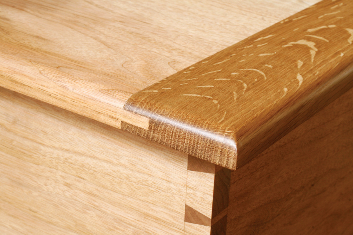 While most of this chest is made from butternut, I used red oak for the lid’s breadboard ends and the cove molding that runs around the base. These parts will probably get dinged over the years, so I chose a wood that is more durable than butternut. Combining woods like this may sound unusual, but cabinetmakers of long ago adopted the same practice, particularly on chests that were going to be painted. I wouldn’t paint this chest, of course, but I like the effect. It’s quite striking, and honors those craftsmen’s practicality.