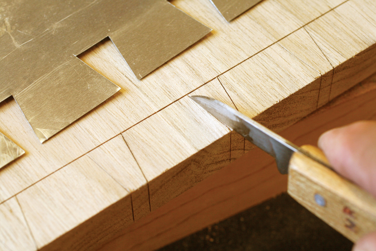 I cut the tails to the line, saw most of the waste between them with a jeweler’s saw (Photo 3), then pare the baseline from both sides. I lay out the pins directly from the tails, again using a marking knife. I cut the pins a little fat, then undercut them a bit and chamfer their inside edges—to make assembly easier—and pare to the lines.