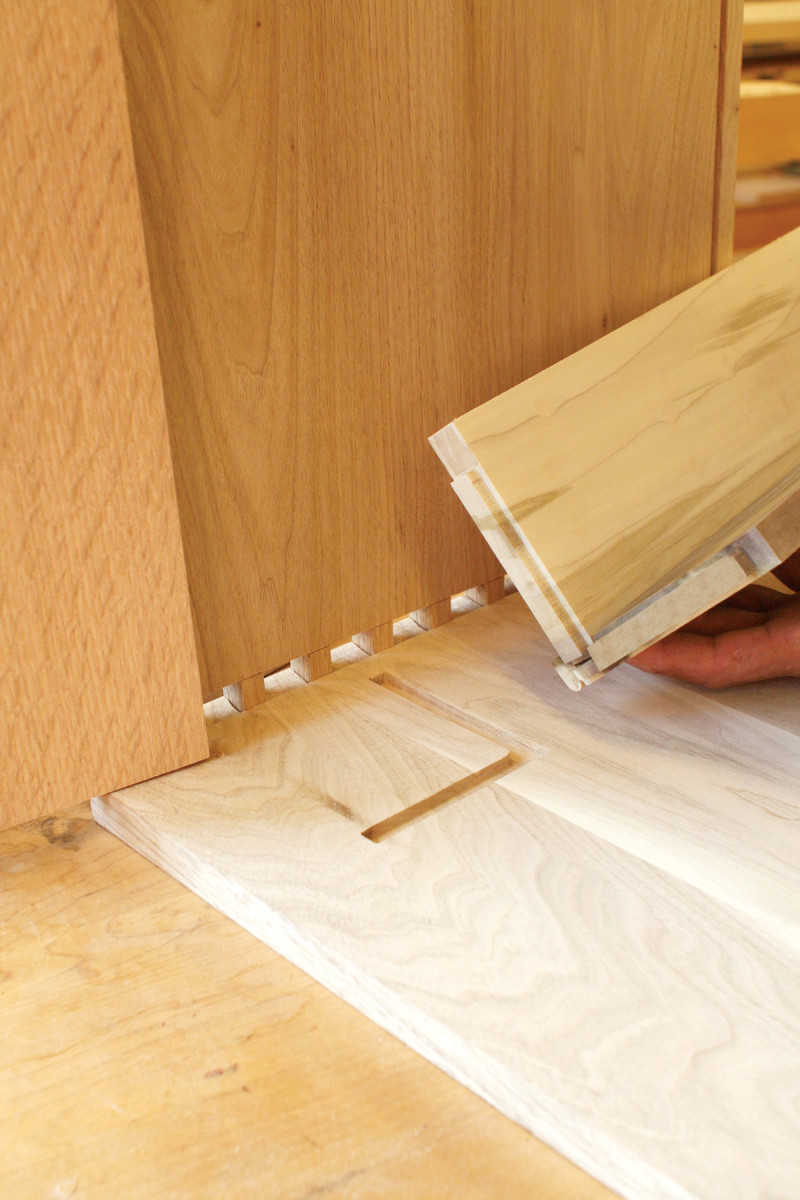 c) The width of the bottom is 1/4″ narrower than the distance between the grooves in the front and back of the chest.