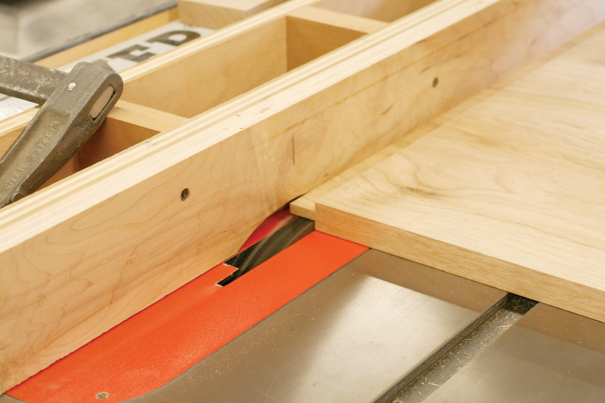 The front (A), back (B) and sides (C) of the chest are 16″ wide, so you’ll probably have to glue them up. I used two wide boards for the front and sides and a number of narrower boards for the back. When you glue these pieces, take every precaution to make sure that the joints are even and the whole assembly stays flat. Rip the panels to final width, then trim them to final length using a crosscut sled (Photo 1).