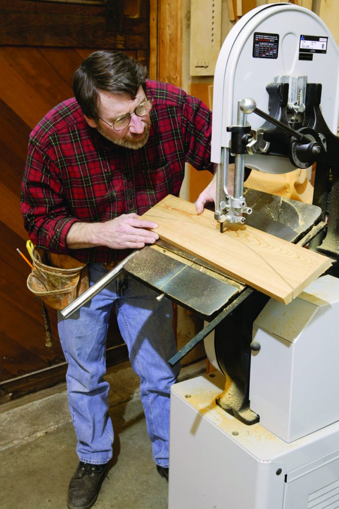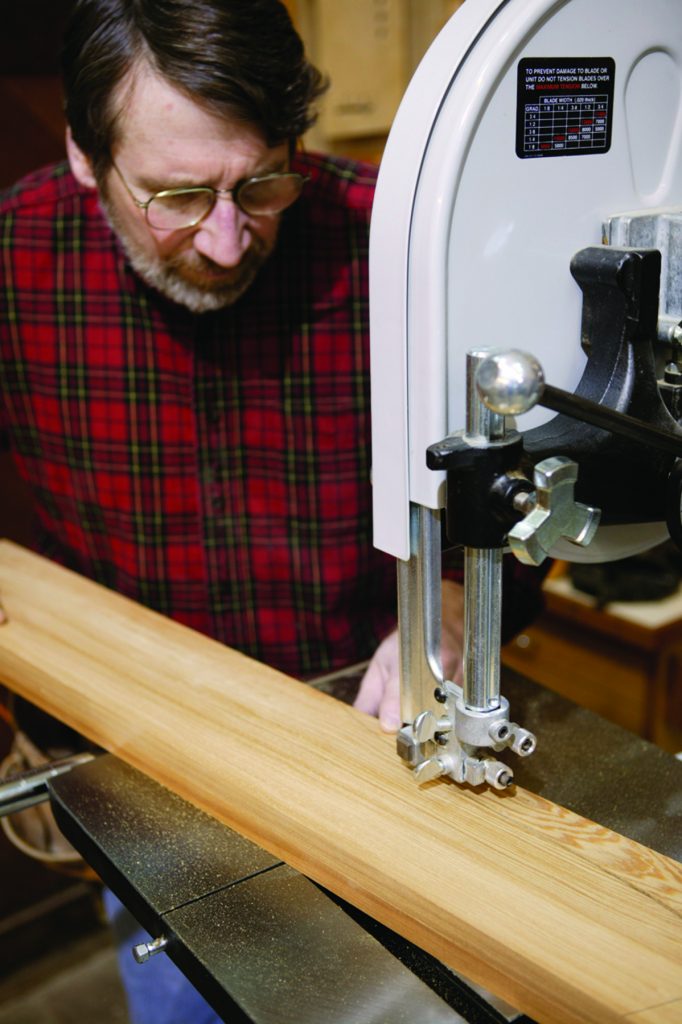 Cut the upper rear crosspiece’s inside curved edge at a 30° angle. Then return the band saw table to 0°, or square, and cut the round ends.