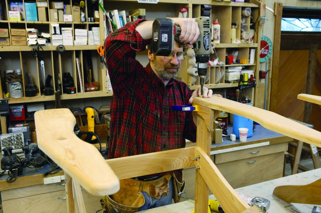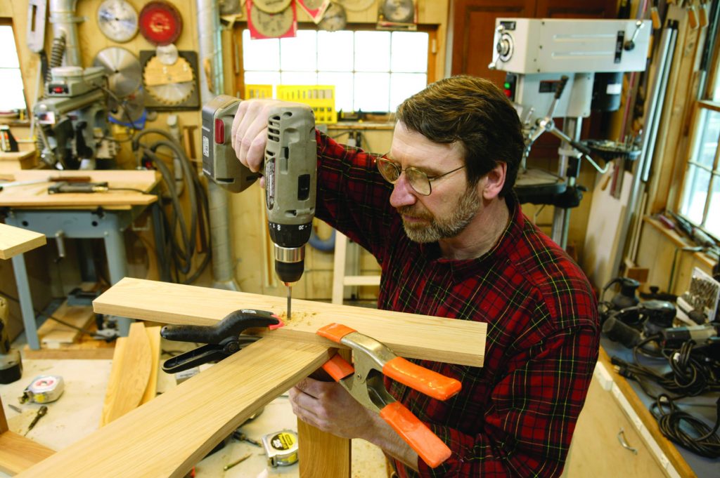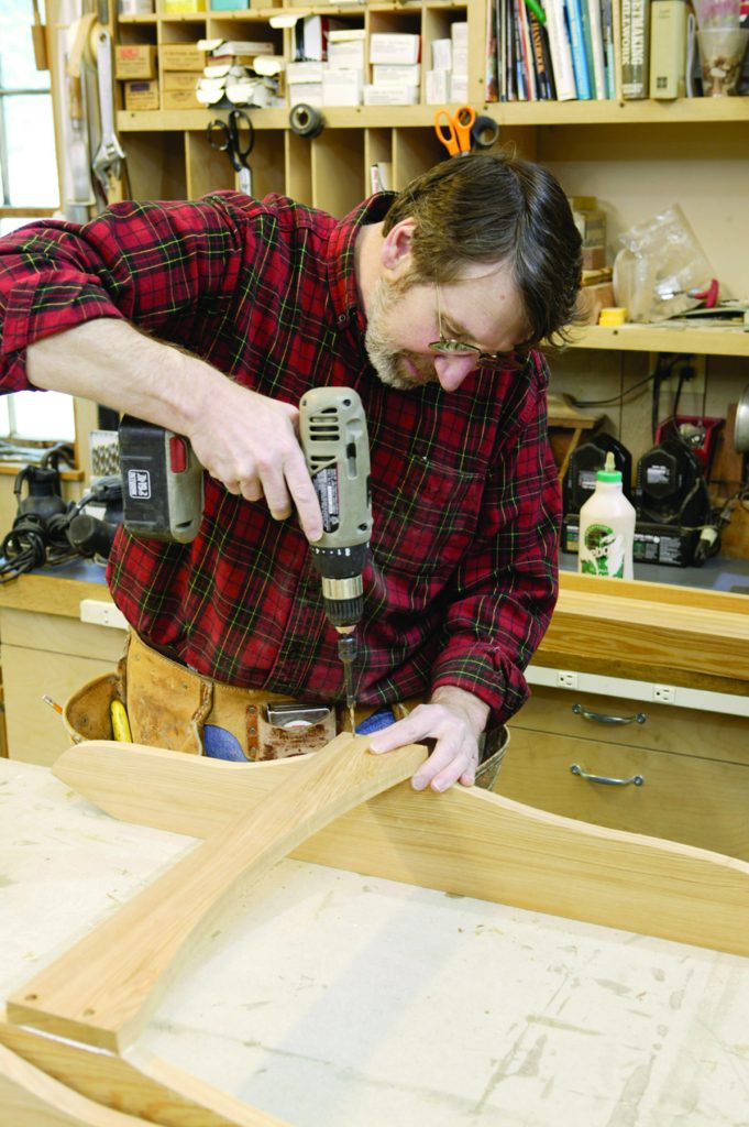 All screw holes should be pre-drilled for a couple reasons; to prevent splitting by drilling a pilot hole and to countersink sufficiently to accept a wood plug later. The plug not only helps the appearance of the chair, but will also add to the chair’s durability. We used a bit that drilled the hole and counterbored for the plug in the same operation.