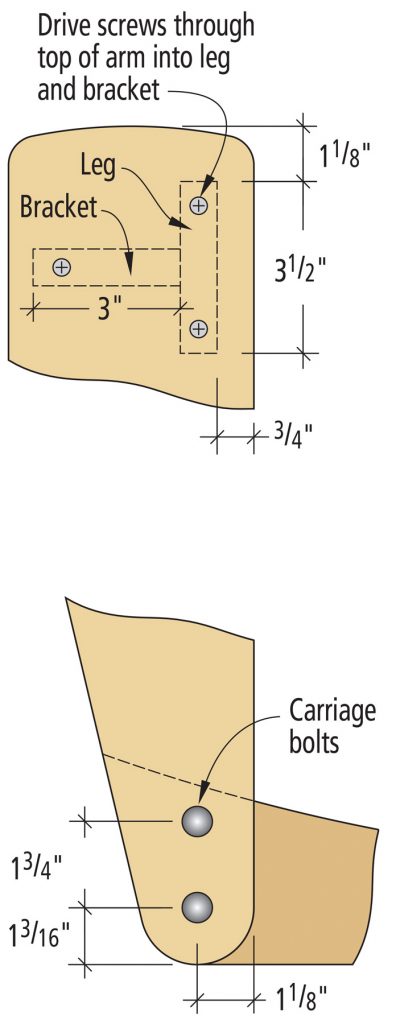We attached the arm brackets first. The top, or wide part of the bracket, is positioned flush with the top of the leg and centered on the leg’s width. Clamp each one in place then drill and countersink for the upper screw in each bracket. Repeat for the lower screw but use a shorter, 114” screw.