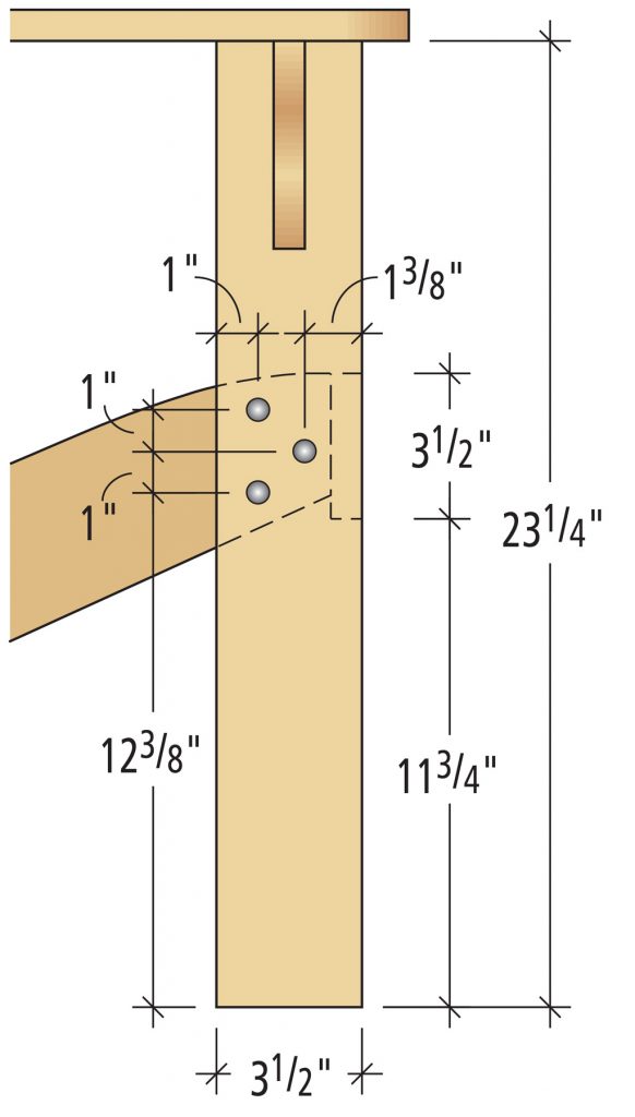 Drill 1⁄4″ holes through the side members and front leg to accept stainless steel carriage bolts. Use a clamp to hold the parts in position; the leg should be flush to the side’s front edge and 113⁄4″ up from the leg bottom to the bottom edge of the front crosspiece.