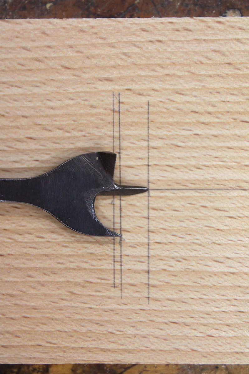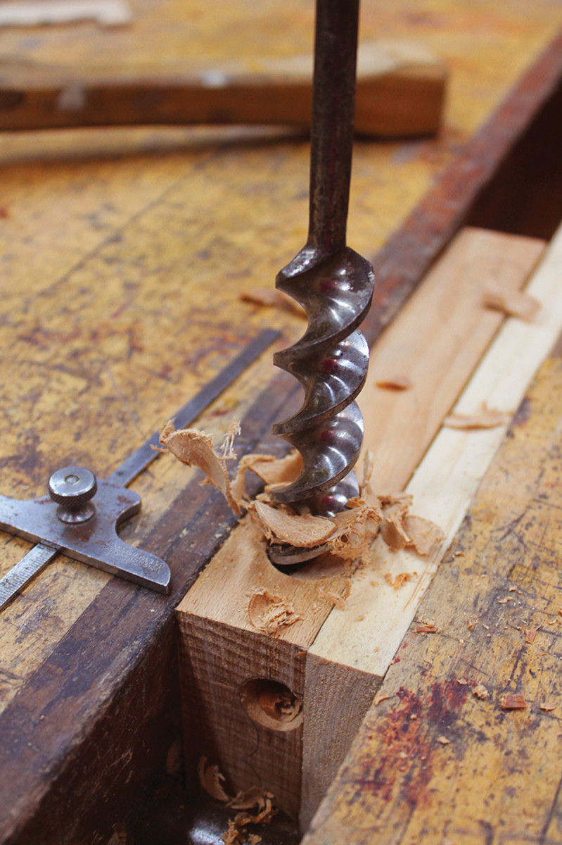 Bit selection. A No. 100 Jennings-pattern bit works for the long-grain holes, but for end-grain drilling, a centerpoint is the better choice.