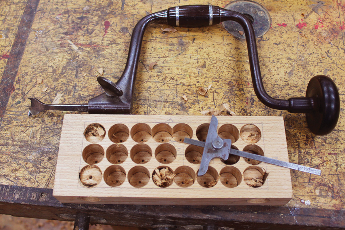 I had a block of quartersawn beech, so that’s what I used for the box shown here. It’s a tough wood; that’s great for wear resistance, but not so easy to drill. I recommend mahogany as perhaps a better choice for yours; it’s easy to work and is historically correct.