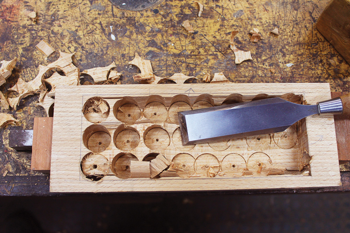 For this box, I laid out and drilled 24 holes to hog out the waste. Why “laid out?” You have to identify the centerpoints and leave plenty of leeway between the box sides and the holes themselves. Generally, I needed about 100 turns of the brace to drill a hole 7⁄8” or so deep. I kept the holes shallow enough so that I could bring them to final depth (11⁄16“) with a router plane.