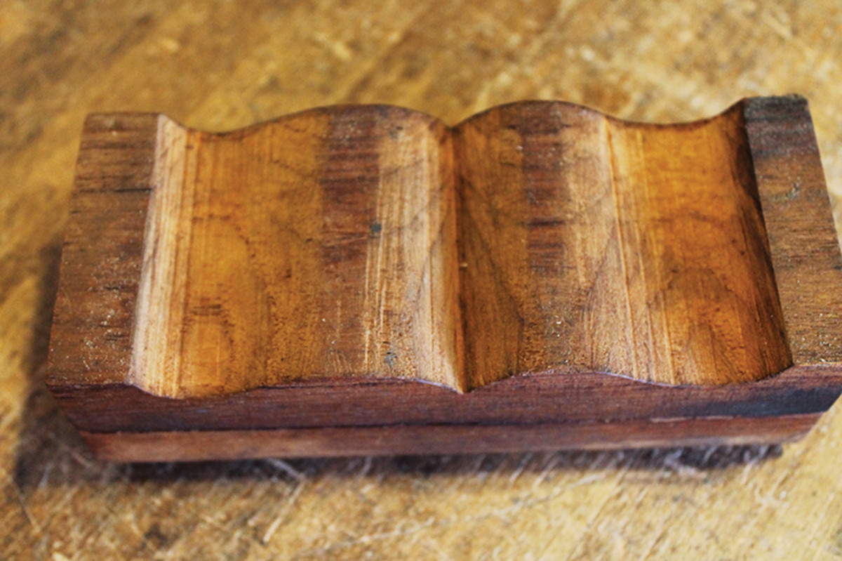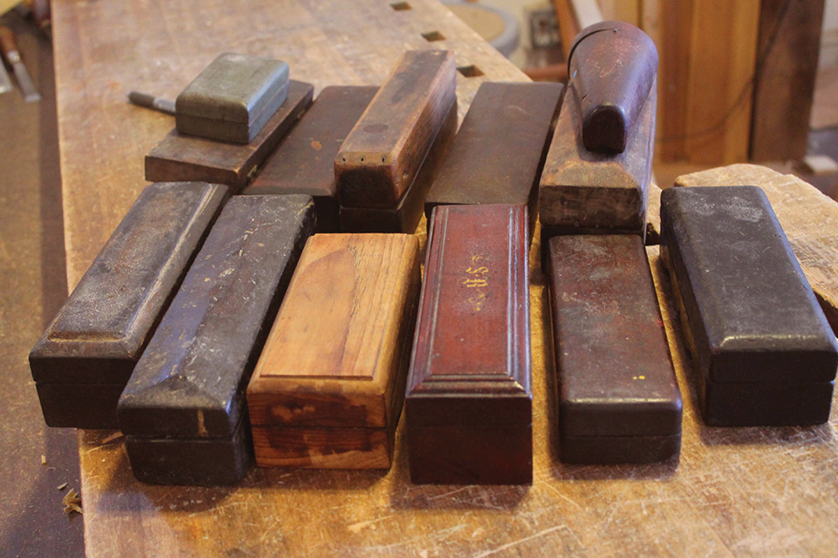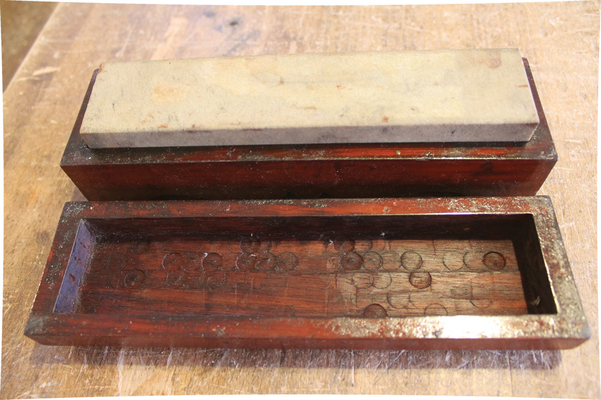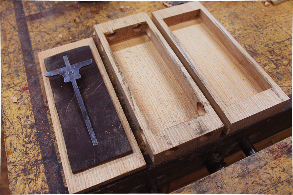 The examples I studied all have cavities to hold sharpening stones. I needed a platform to which to glue the leather, so I adjusted my design to accommodate that – but the techniques shown here can be used for either type of box.