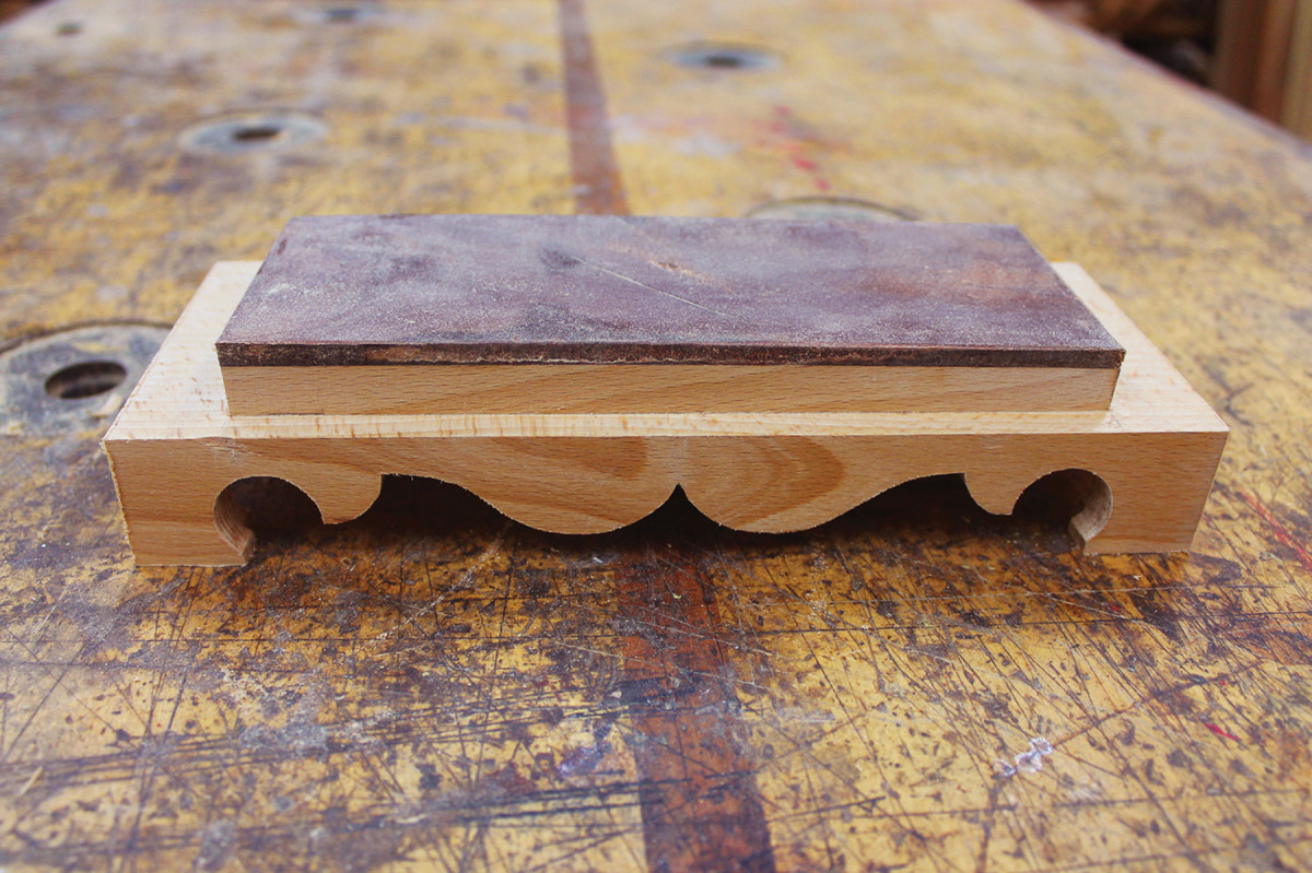 Once the platform is sized, verify that the leather strop has the same dimensions, then glue it to the platform with hide glue.