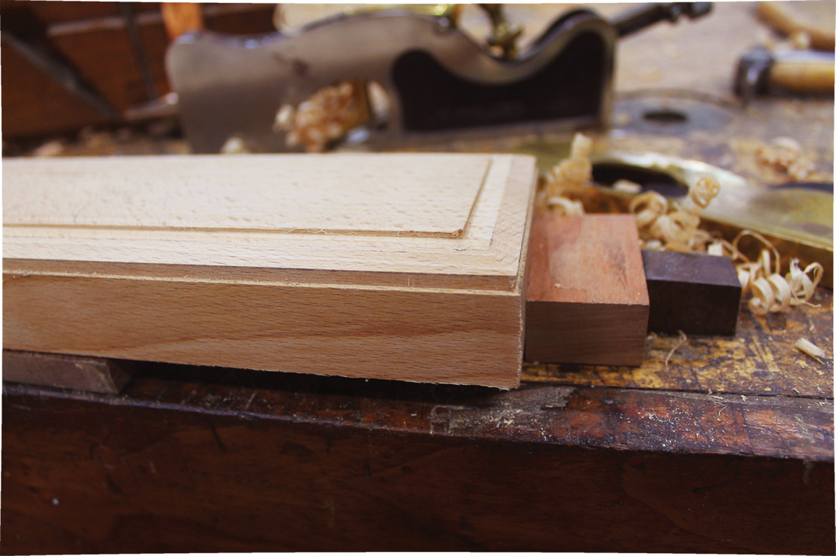 After the glue is dry, re-scribe the top of the bottom with a marking gauge, making just one end-grain mark and one long-grain mark. Apply hide glue, carefully align the platform to these two lines and clamp it to dry.