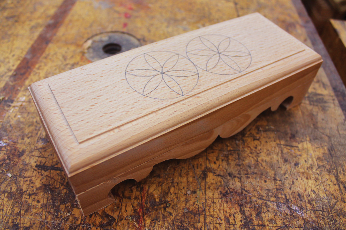 The scratch decorations on my box top are laid out with a compass. Here I wanted to make two circles touching at a single point, with a hex symbol inside each circle.