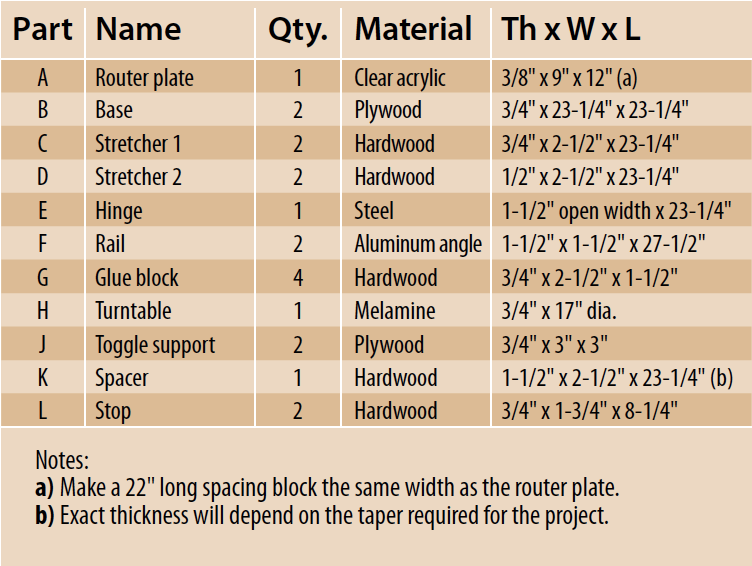 Basically, the jig allows you to rout across a circle, making a pattern like the spokes on a wheel. You rotate the circle after each pass, using a dirt-simple system of indexing marks. I also designed the jig to tilt, so that the router could cut deeper on the circle’s perimeter than near its center. This has the effect of making the cuts taper in width and depth.