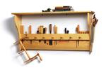 Build a right-angle stand for drilling axle holes in the doors (Photo 3). Carefully lay out the holes and drill. Make the axles (H and L) from 3/16″ dowel rod, available at craft stores and home centers. Cut the axles to length (Photo 4), but don’t glue them in the door. Make the shelves (Fig. 04) and glue them in place.