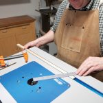 Set up the router with a fence and auxiliary wood fence that will slide smoothly (without any slop) in your jig’s wooden track. Then, set the fence so that the cut will be 1⁄8” from the outside face of the leg.