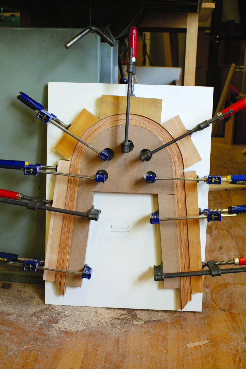 It’s a good idea to have help during the glue-up. One person bends the laminations around the form, while the other puts the blocks in place and tightens the clamps.
