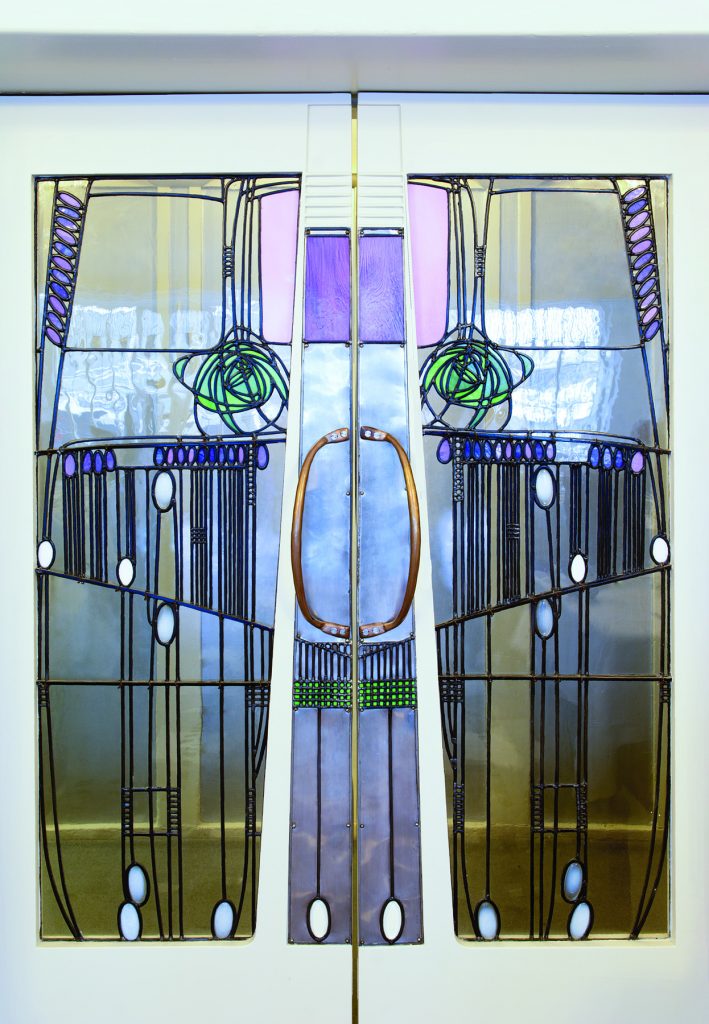 Stained glass in the door to the Salon de Lux echoes the motifs found in the furniture and decoration in the other areas of the Tea Rooms such as the fire place in the Back Salon.