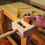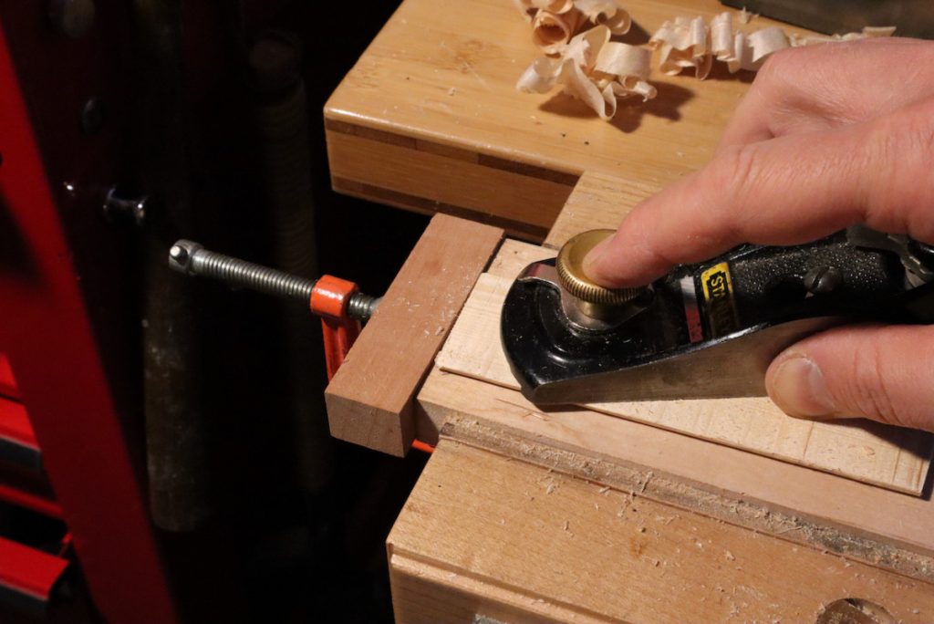 Then I placed the strips on a makeshift planning board (notice the C-clamp adjusted planing stop) and planned the strips to uniform thickness.