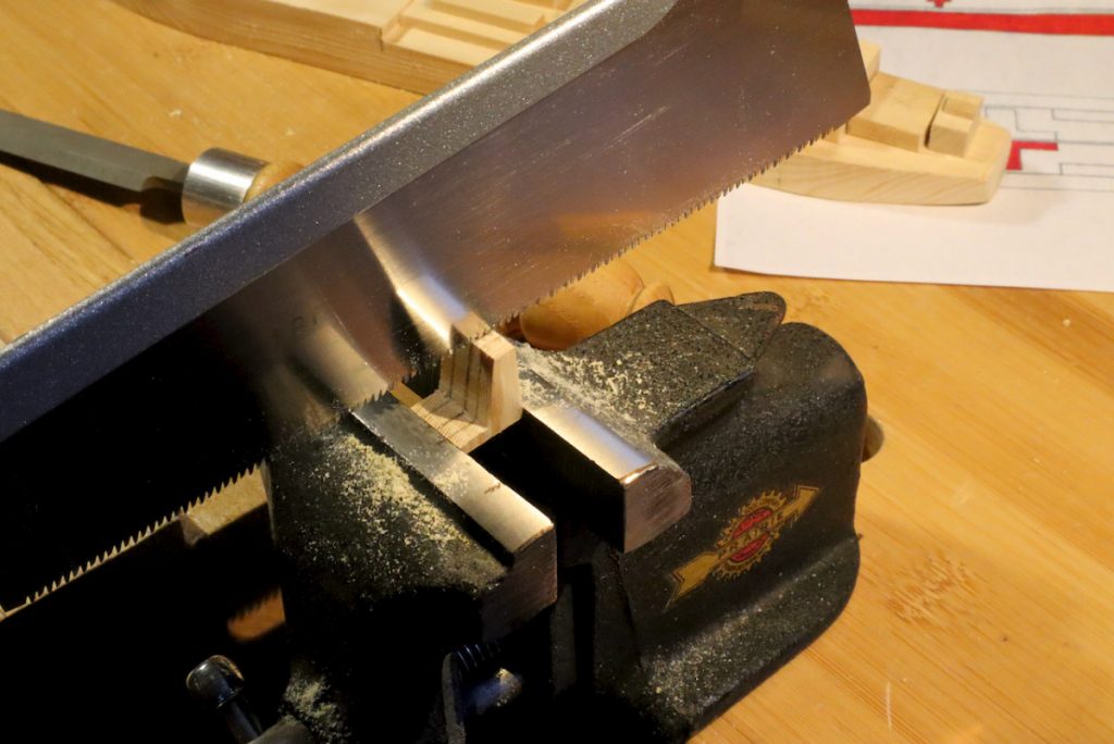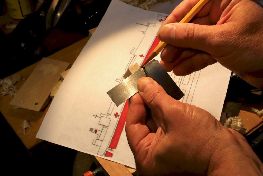 Most of the superstructure elements were cut on the bandsaw and then filed, chiseled or plane to final dimensions. I began by transferring their width and length dimensions, from the deck drawings to the thin strips, making sure that the parts’ thickness will match the elevation drawings. I used a marking gauge and a small square as needed to outline what need to be sawn.