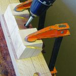 Now find the longitudinal center of the top beam and mark in 3″ from the each end. These points will be the centers for the screws. Line up the beams, inside faces together, and clamp them together. Chuck an extra long 1⁄8” drill bit into the drill press, make sure everything is lined up and square, then drill through the top beam into the base. This pilot hole marks the center alignment for the screws in both beams.