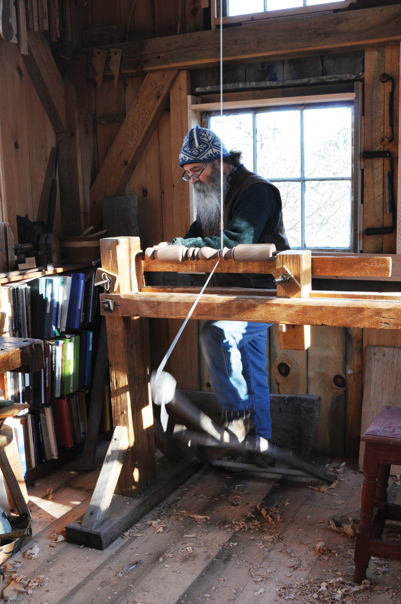 My lathe is a simple machine, framed in oak and fastened with wooden wedges and iron nuts and bolts. I’ve had it since 1994 and am quite accustomed to its idiosyncratic traits. It’s a pole lathe, with one upright extended above the bed to form one “poppet” and the other moveable and secured with a wooden wedge. The workpiece is fastened between the centers of the lathe, which are mounted in these poppets.