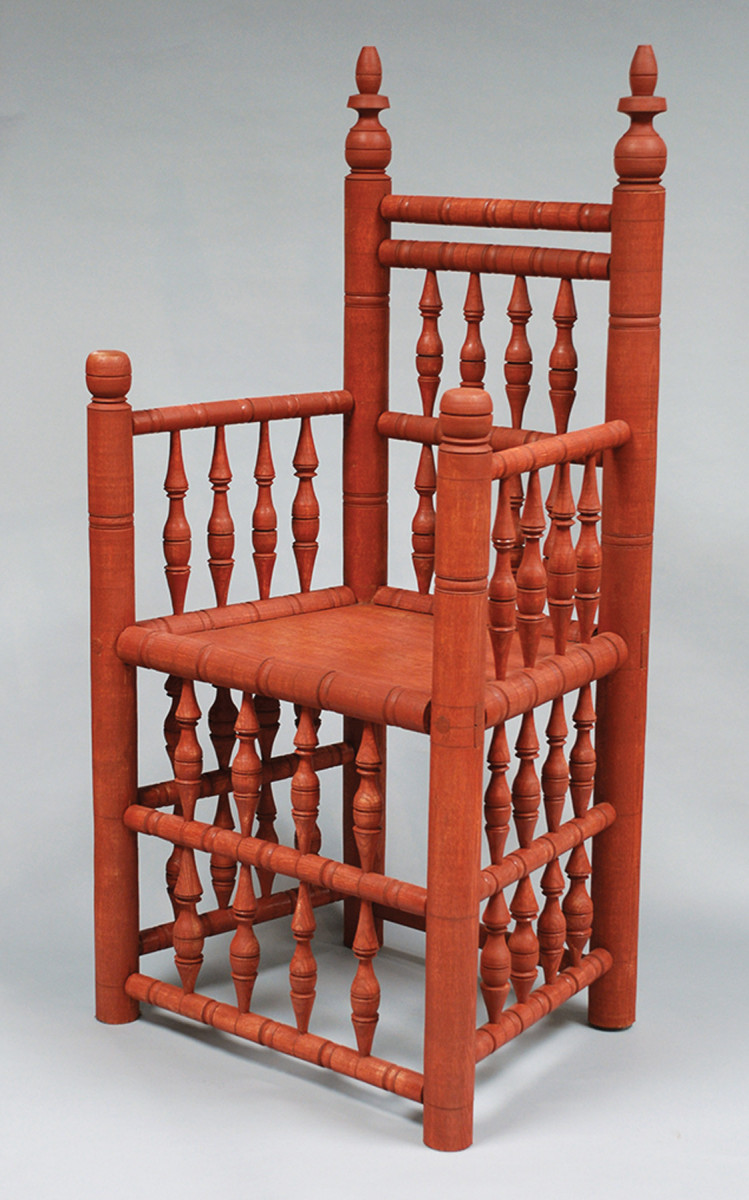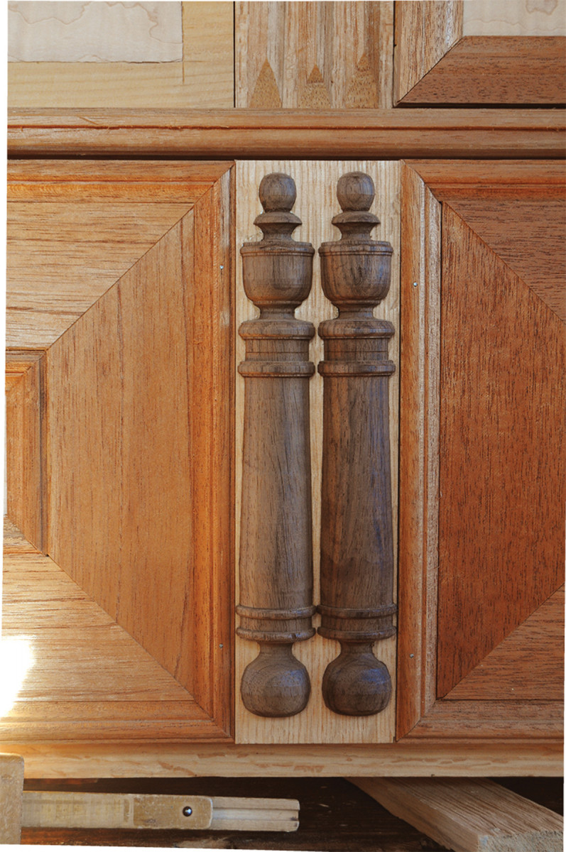 Applied work. Not all turnings stay in the round. Here’s a pair of split turnings glued and nailed to a joined chest.