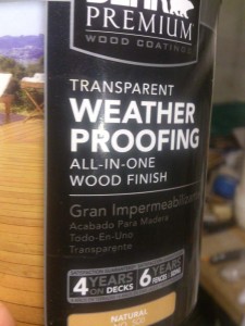 Why not? It was available in a spray can for about $5, so I thought I’d give it a try in the name of science. After the first coat, I like how it reveals the grain patterns in the wood. We’ll see how it holds up. Thompson’s needs to be reapplied every year, I’m told.