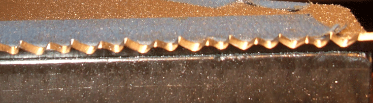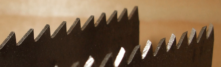 Rip teeth vs. crosscut teeth. Rip teeth (left) are shaped like tiny chisels and are shaped and sharpened by filing square across the blade. Crosscut teeth are shaped more like knives and are formed by filing at an angle to the blade.