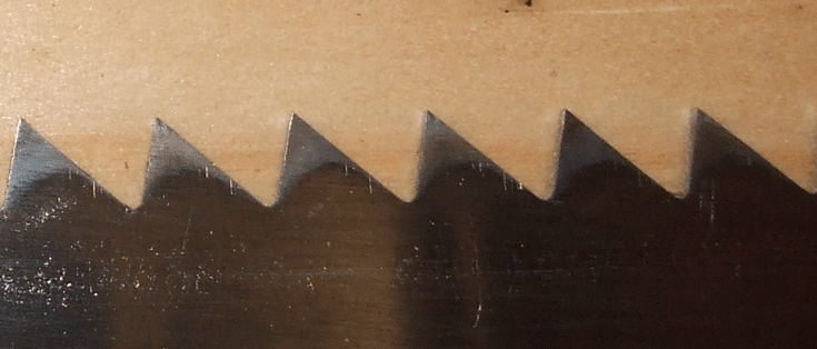 Rip-tooth geometry. A ripsaw is filed to form a row of tiny scrapers. The moment the flat formed by jointing is filed away, the saw is sharp.