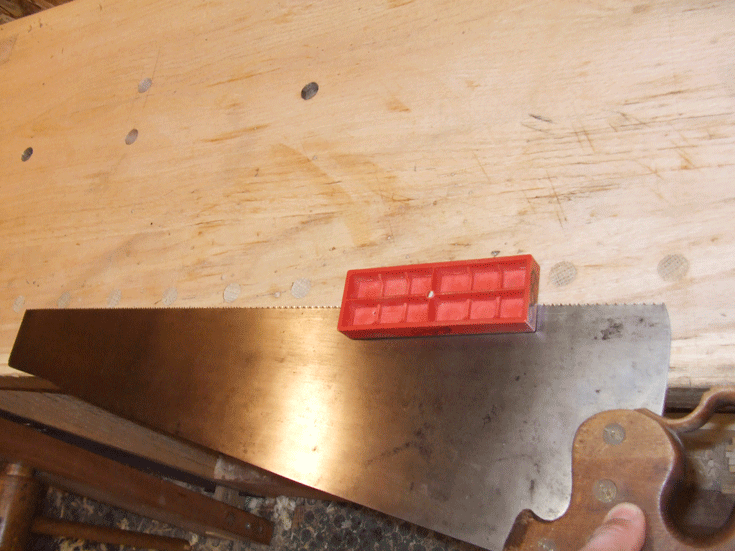 You may find that in a test cut after sharpening a fine rip-filed saw (14 ppi and up), it steers to one side. This is a common result from a burr on the teeth left from filing only from one side. To remedy this, take an extra stoning pass on the side toward which the saw is steering. This will remove the burr and even the cut in the kerf.