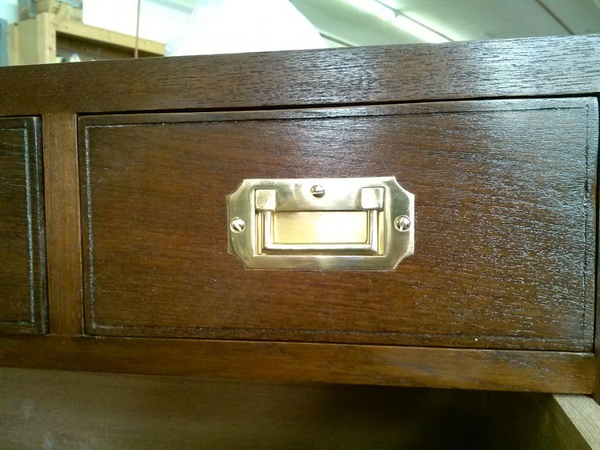 However good my template was I still had to recruit some hand tools for the task of final fitting it. You see, routing, even with the smallest bit will still leave you with round corners, and to square a round corner you will need a hand tool such as a chisel. More than this, not all handles are made the same. Even under the best quality control, and Paxton handles are made to high standards, there could be tiny variations between one handle and another. To trace the exact outline of the handle I used a small marking knife made by Lee Valley. I then used a chisel to cut the excess wood to the marked line. Next I pressed the handle in and secured it with screws. I drilled pilot holes to prevent the brass screws from breaking in the teak drawer front. In some cases I recommend lubricating the screws with wax in addition to pilot drilling. After I was satisfied with the results on the scrap pieces I began the actual installation of handles on the the drawers.
