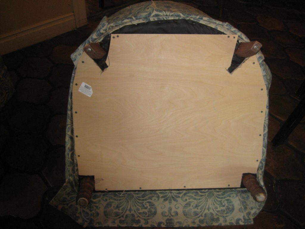 Wanting to please my daughter-in-law, I proposed a very unprofessional repair of screwing a plywood panel to the underside of the chairs to push the springs back up to their supporting positions.