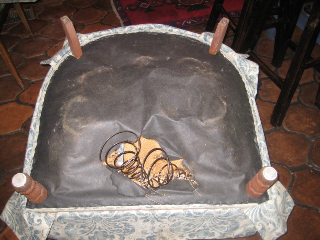 So while I was there we turned the chairs upside down to size up the problem. Several of the springs had come untied (the tying didn’t appear to my unprofessional eye to have been done that well in the first place) and so they weren’t providing the support needed.