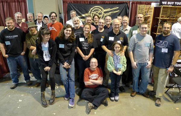 The Proud & Unplugged, WIA 2013: Far Back, L-R/: Isaac Blackburn-Blackburn Tools; Raney Nelson-Daed Toolworks; Dave Jeske-Blue Spruce Toolworks; Konrad Sauer-Sauer & Steiner Toolworks. Next Row, L-R: Deneb Puchalski-Lie-Nielsen Toolworks; Thomas Lie-Nielsen-Lie-Nielsen Toolworks; Christopher Schwarz-Lost Art Press; Scott Meek-Scott Meek Woodworks; Ron Hock-Hock Tools; Robin Lee-Lee Valley/Veritas; Next Row, L/R: Rhett Fulkerson-Nice Ash Planes; Matt Evans-Evans Wooden Screw Co.; Geoffrey Noden-Adjust-A-Bench; after Geoffrey and in front of Scott and Ron: Fred West; then, (tall in green long sleeves) Tony Strupulis-Raven’s Edge Toolworks; Front Row, L-R: Kylie-Gramercy Tools; Ben Selzer-Tools for Working Wood & Gramercy Tools; Katie Fulkerson-Nice Ash Planes; Mark Harrell and his beautiful daughter-Bad Axe Tool Works; Nick Dombrowski-Lake Erie Toolworks; Mark Hicks-Plate 11 Bench Co.; Seated: Joel Moskowitz–Tools for Working Wood & Gramercy Tools.
