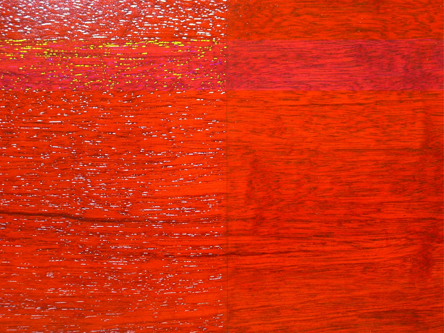 Unfilled vs. filled. The difference on a wood such as this unfilled mahogany surface (left side) and a filled mahogany surface (right side) is striking. The pores on the unfilled side break up the light creating a raw look. The filled side looks richer, deeper and more elegant.