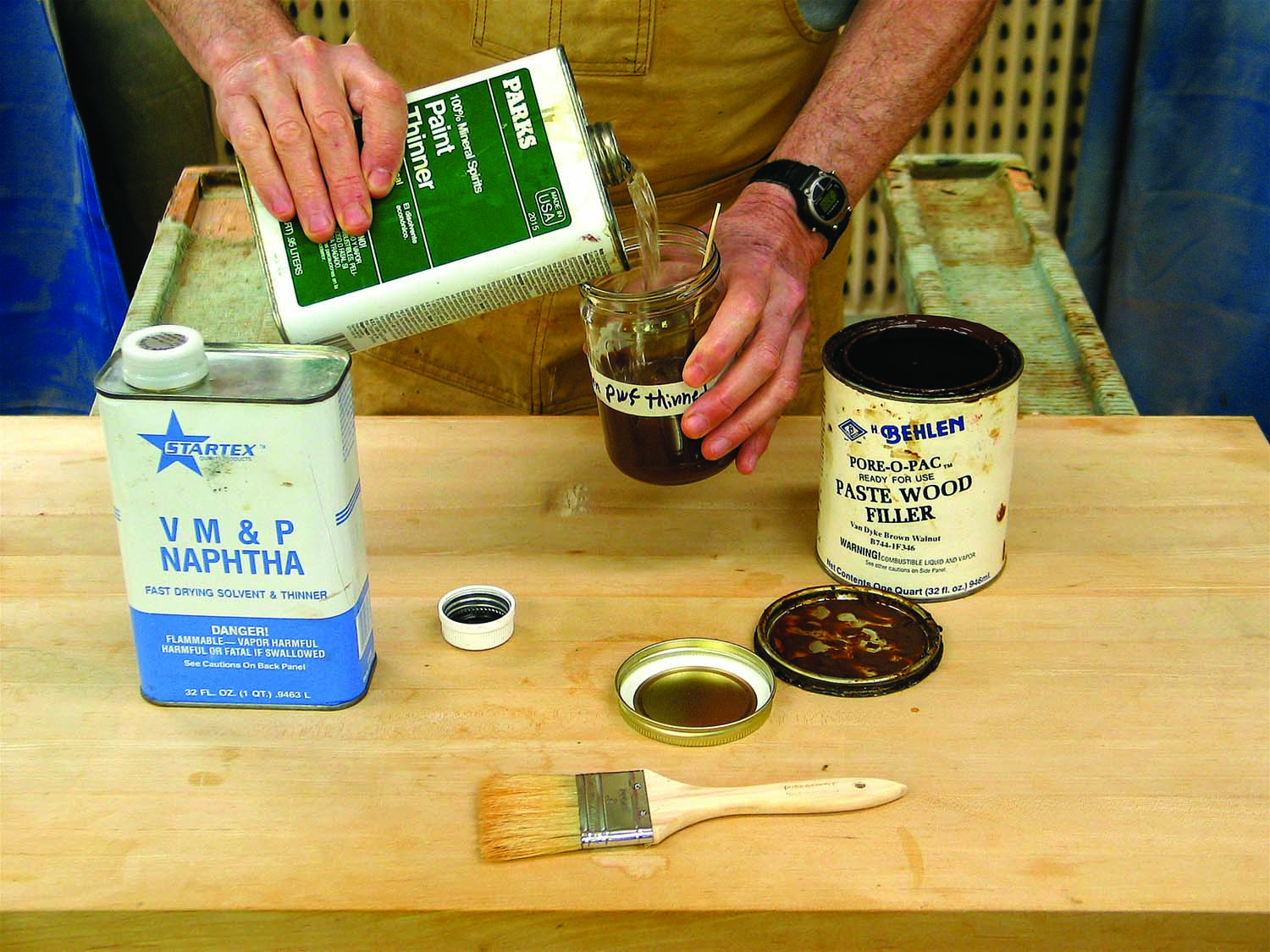 In most cases it’s best to thin the grain filler to make it easier to spread or spray. Use mineral spirits or naphtha (for faster evaporation) with oil-based fillers and water with water-based fillers. You can apply grain filler successfully at any consistency. I like to thin it about half to an easily brushable consistency.