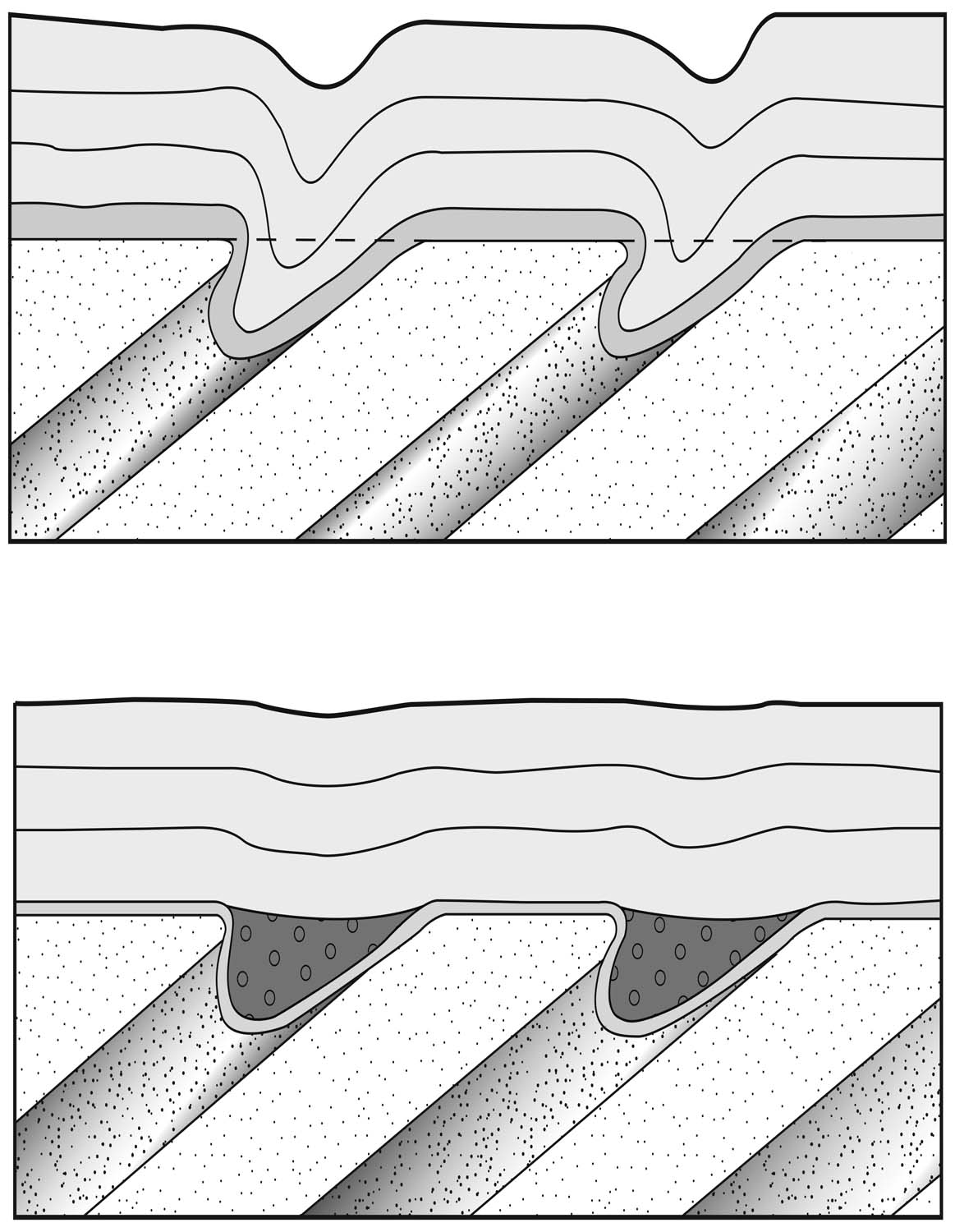 Unfilled pores (top). Topcoats follow the contours of this unfilled wood surface. Filled pores (bottom). You can use grain filler to fill pores almost level. But to get the surface perfectly mirror-flat, you still have to sand a little.