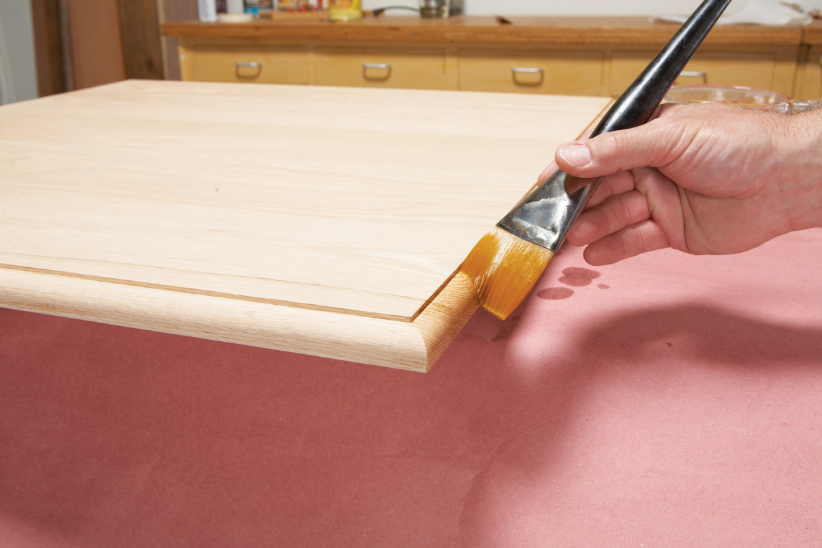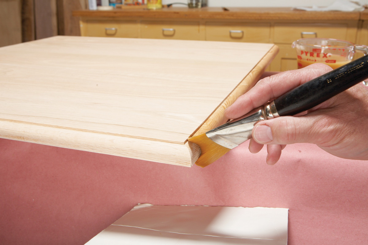 There are two ways to brush shellac: Lay down a thick layer using a slow gravity-feed method or paint it on thin and work fast. I use both of these brushing techniques on a small tabletop: the gravity-feed method on a molded edge and the rapid brushing method on a top. I prefer the gravity method on the edges because the brush can cover the whole edge and leave a relatively thick, even coat without worrying about ridges. I use the fast and thin method on the top of the table because it’s less prone to leaving ridges and brush marks.