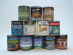 Twelve brands of water-based finish with often unclear labeling.
