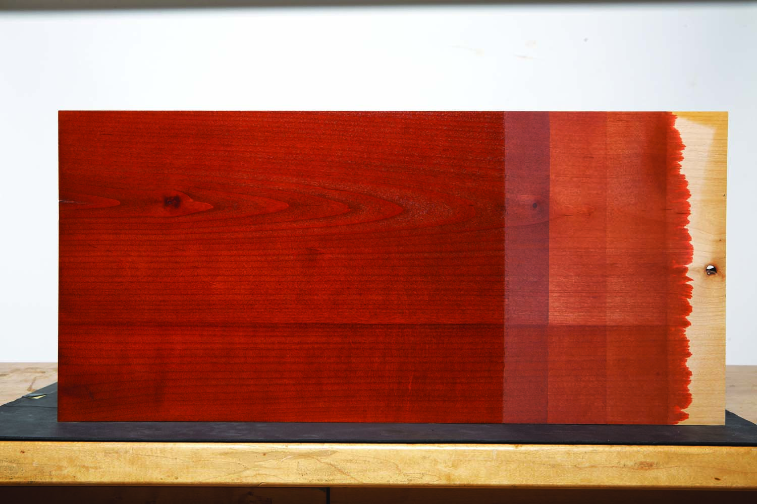 Water-based dyes work extremely well to provide intense rich dark color with very little blotching, so no stain controller is needed (Photo 7). Dyes work best when the goal is to minimize the wood’s figure and grain in order to show a texture so uniformly smooth that it can actually shimmer. Water-based dyes also work very well to create lighter tones on red alder, with luster and shimmer that resembles the look of maple or birch.