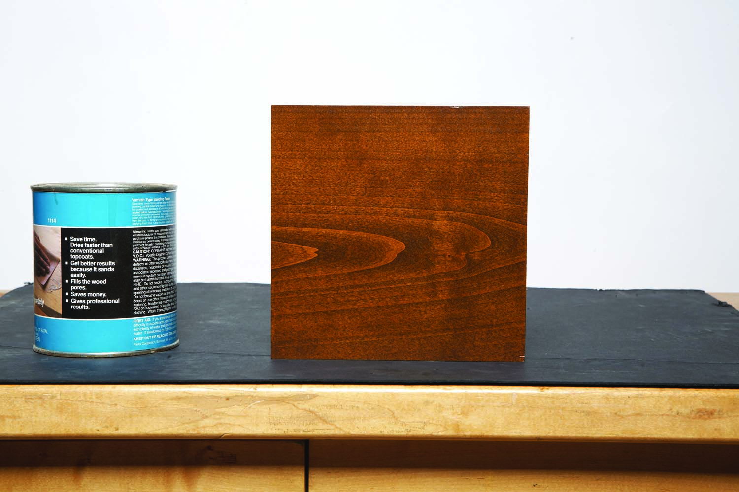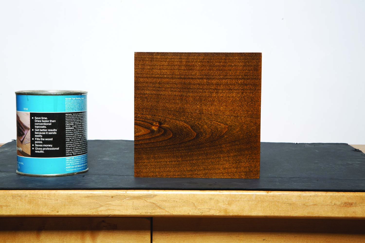 Photo 14. Step 1 Generously apply Transtint Dark Mission Brown dye in water. This sample was done with the dye mixed at the standard strength recipe as directed on the label. Continue to work in the dye with a damp rag for at least a minute to allow for thorough and consistent saturation of the surface. Rub off the excess with dry rags or paper towels. Let dry for an hour. Step 2 Apply your favorite topcoat. A wipe on/rub off finish such as Sam Maloof’s poly/oil will enhance the look.